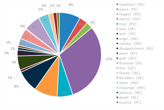 Using the Chinese vocabulary ontology, the emotion of the text corpus is further divided. According to the construction of emotional vocabulary noumenon [35], emotions can be divided into seven categories and 21 sub-categories. These seven categories are happiness, goodness, anger, sadness, fear, evil, and surprise, of which each category has subordinate sub-categories, which provide a standard for our emotional classification, as shown in Table 3. Each sentiment word has the characteristics of polarity, intensity, part of speech, category, and so on. According to the intensity, it is divided into five intensities: 1, 3, 5, 7, and 9. The overall intensity of 21 emotions were calculated.