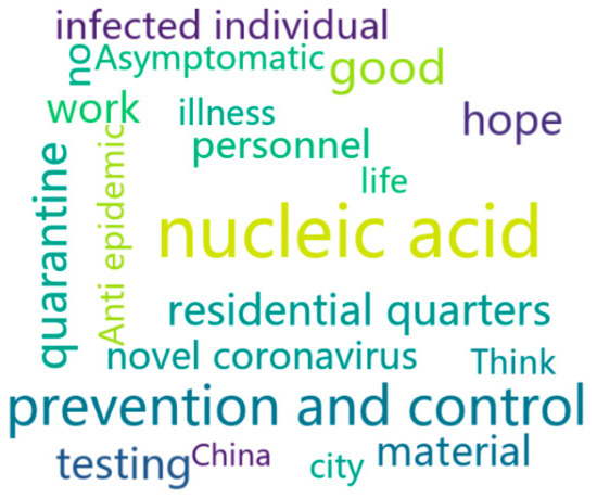 By calculating the word frequency of the result after word segmentation, we can obtain the top 20 words that appear frequently. The word cloud is generated according to these words. The word cloud can intuitively display the contents that the public pays more attention to in the epidemic situation in Shanghai, as shown in Figure 4. The word frequency table is shown in Table 6. Through the word frequency table and word cloud diagram display, we can see that nucleic acid-based virus detection is the most popular concern in the epidemic, and material problems are also more concerning. There are problems in material coordination in the early stages of the epidemic, and the government should learn from this experience.