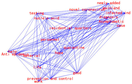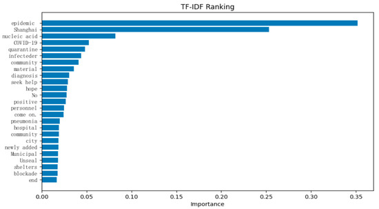 Use the TF-IDF algorithm to calculate keyword contributions, based on the Jieba analysis. The tags () method is implemented, as shown in Figure 6. As can be seen from Figure 6, the theme of the document revolves around the Shanghai epidemic, and words such as COVID-19, community, and nucleic acid also have a high degree of contribution.