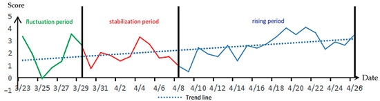 Considering the different numbers of microblogs per day, the daily average emotion score is used as the trend chart. The trend of emotion score can be divided into three periods: fluctuation period (FP), stabilization period (SP), and rising period (RP), as shown in Figure 7. It can be seen that the emotion scores fluctuated greatly from 23 March to 29 March, indicating that the public mood easily and greatly fluctuated in the initial stage of the epidemic. On 25 March, the only score below 0 appeared. From 30 March to 8 April, the emotion score fluctuated slightly compared with the previous stage, indicating that public emotion may be gradually stabilized due to the influence of the government and all sectors of society in the fight against the epidemic. From 10 April to 26 April, the overall emotion score showed an upward trend, indicating that the public attitude towards the fight against the epidemic was more positive.