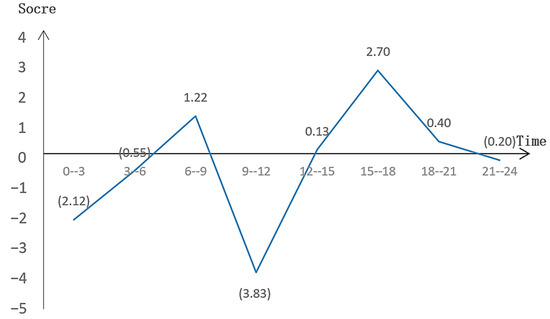 Take 25 March, the day with the lowest emotion score, as an example, and divide the 24 h of that day into four stages; each time stage is 3 h, and the emotion score trend of that day is shown in Figure 8. Based on the crawled text content and the Weibo hot spots of the day, the public raised great doubts about the grid management that was implemented at that time. Similarly, the incident of nurses in Shanghai Oriental Hospital, which appears many times in the text, is also one of the reasons for the low score of public emotion. From 9:00 to 12:00, Shanghai usually holds a press conference on the epidemic situation on that day. At the same time, the relevant topics are hot. The reason may be that the anti-epidemic work at the initial stage of the epidemic did not meet the public’s expectations.