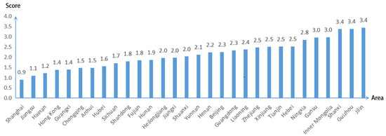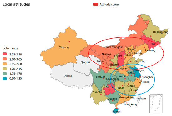 Due to the low mobility of citizens during the epidemic, the emotional score was calculated by province, according to the user’s IP address. The four provinces with smaller sample sizes (less than 200) were excluded. These four provinces were Macau, Tibet, Qinghai, and Taiwan. The scores are shown in Figure 9. The lowest score was 0.9 in Shanghai, the center of the epidemic. Jilin’s highest emotion score was 3.4. It can be seen that the provinces with scores in [2.0, 3.4] are far away from Shanghai, except for Zhejiang. As shown in Figure 10, the closer the geographical location to Shanghai, the more negative the overall attitude.