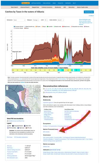 - Lam, V.W.Y.; Tavakolie, A.; Palomares, M.L.D.; Pauly, D.; Zeller, D. The Sea Around Us catch database and its spatial expression. In Global Atlas of Marine Fisheries: A Critical Appraisal of Catches and Ecosystem Impacts; Pauly, D., Zeller, D., Eds.; Island Press: Washington, DC, USA, 2016; pp. 59–67. [Google Scholar]