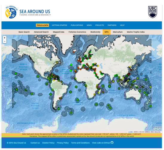 The MPA data produced by this research is directly accessible on Sea Around Us under the ‘Tools & Data’ tab on the toolbar (http://www.seaaroundus.org/data/#/mpa (accessed on 10 May 2022)).