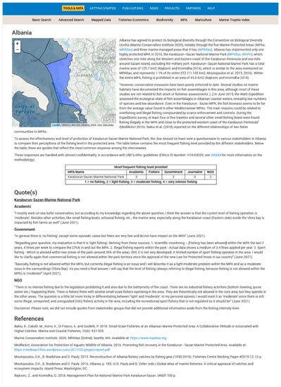 Anonymized quotes from our exchanges with stakeholders are also presented on the Sea Around Us MPAs page site (Figure 3) to illustrate the thought process behind the common fishing level responses. The introductory narrative, fishing level responses, quotes, and references were added to the Sea Around Us’ database system as CSV files, to allow for easy access and updates. Moreover, while inputting the information into the database and adequately presenting the information on the website, tags were added to words that needed to be hyperlinked, italicized, underlined, and/or bolded. Most of the MPAs were hyperlinked to MPAtlas and Protected Planet to provide the most up-to-date information, allowing users to expand their knowledge by travelling between those websites and ours. Fish species that are mentioned on the webpage were linked to FishBase (www.fishbase.org; accessed on 15 March 2022) and other marine animals to SeaLifeBase (www.sealifebase.org; accessed on 15 March 2022) through hyperlinks, allowing users to find more information about the species in question, such as the distribution range, size, life cycle, threat status, etc.