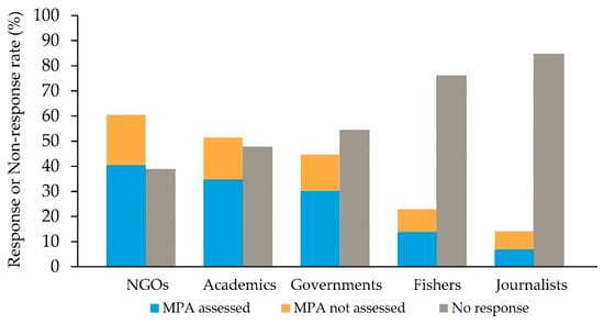 Response and non-response rates (in percentages) to our one-question questionnaire by stakeholder groups. The response ’MPA assessed’ indicates that the recipient responded to at least one email with a fishing level, while ’MPA not assessed’ means that the recipient responded to at least one email but did not provide a fishing level category. ’No response’ means that the recipient did not respond to any email they received.