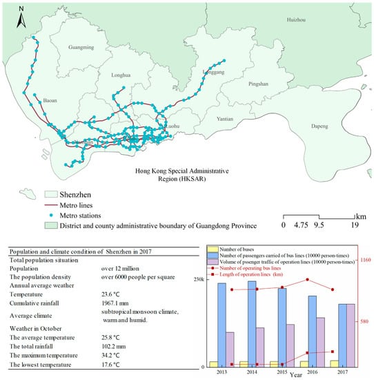 Shenzhen is selected as the study area in this paper due to the prevalence of public transport, a relatively high travel proportion of passengers using smart cards, and a dense public transport network. The main reasons are as follows: first, Shenzhen, located in the Pearl River Delta, is adjacent to the Hong Kong special administrative region and is one of the fastest growing and most economically developed cities in China. Second, as shown in Figure 1, the climatic conditions change greatly, and the weather in October is hot. If the temperature is higher than 25 °C, it is considered a hot day [16]. Third, as one of the first-tier cities in China, Shenzhen has experienced rapid growth in private cars and taxis. However, public transport remains the major travel mode for most people in this city. According to the Shenzhen Statistical Yearbook 2018, at the end of 2017, the public system comprised nine metro lines with 123 stations and 992 bus routes with 17,430 buses. In this year, the total number of bus trips was 1654.25 million, which was a decrease of 11.44% compared with the previous year. In addition, the passenger volume of buses has decreased continuously over the past four years. The total number of metro trips was 1655.45 million, up 27.62% from the previous year, indicating that the ridership of the metro has increased year by year. This may be because some travelers shifted from bus to metro travel. Moreover, many existing studies have chosen Shenzhen as the study area [11,49,50,51,52]. Therefore, Shenzhen is an apt study area.