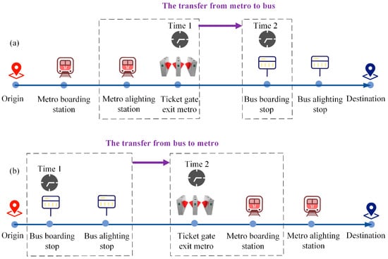 The method for identifying transfer time and transfer ridership is derived from the literature [10,55,56] and has been improved based on the following aspects. First, we record the travel time of all passengers every hour from the metro station to a candidate bus station, which is less than the upper bound of 40 min. We also record the travel time of all passengers every hour from the bus stop to a candidate metro station that is less than the upper bound of 50 min. Specifically, the upper bounds of 40 min and 50 min are mainly set in accordance with the literature related to recognizing transfer methods [10,57]. Existing survey studies show that 95% of the transfer ridership of the metro-to-bus mode has transfer times within 40 min, while 95% of the transfer ridership of the bus-to-metro mode has transfer times within 50 min [58]. Therefore, for the initial identification of the transfer ridership, we set the upper bound of 40 min and 50 min as the elapsed time thresholds for the metro-to-bus mode and bus-to-metro mode, respectively. Then, the 95th percentile of the travel time of the filtered passengers is regarded as the metro-to-bus (or bus-to-metro) transfer time threshold of every hour, namely, transfer time. Finally, based on the transfer time threshold, we identified the hourly transfer ridership at each metro station. The transfer processes of the metro and bus systems are shown in Figure 2. Moreover, to analyze the distribution characteristics of metro and bus ridership, we explored the hourly travel-related variables. The travel-related variables include the inbound ridership, outbound ridership, and bus ridership at each station, which is derived from the metro smart card transaction data.