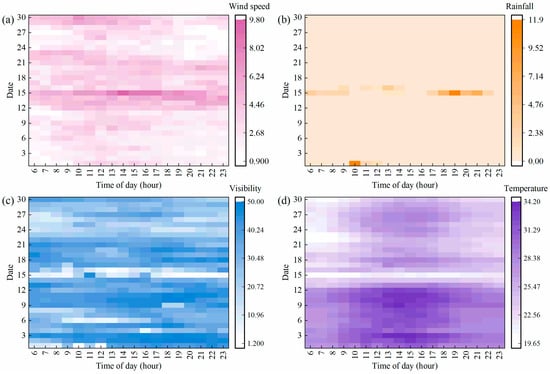 Temperature, wind, visibility, and rainfall have been widely considered in related studies on weather–ridership relationships [20]. Therefore, in this study, the four real-time weather variables are extracted from the raw weather data to investigate the impacts of weather on the transfer ridership. Referring to the existing related research, many studies have adopted continuous weather variables to observe the continuous impact of weather variables on transport ridership [32,43]. In this study, the original continuous data between 6:00–22:59 are selected for the weather variables. Among them, the maximum temperature per hour is used to represent the hourly temperature. The wind speed is represented by the maximum value observed during a given hour. Similarly, visibility is represented by the minimum value in each corresponding hour. The rainfall corresponds to the total precipitation over a given hour. The distributions of the four weather variables are shown in Figure 4. Each weather variable fluctuates significantly over time. These weather variables are then matched with the transfer data to obtain the influence of each weather variable on the transfer ridership.