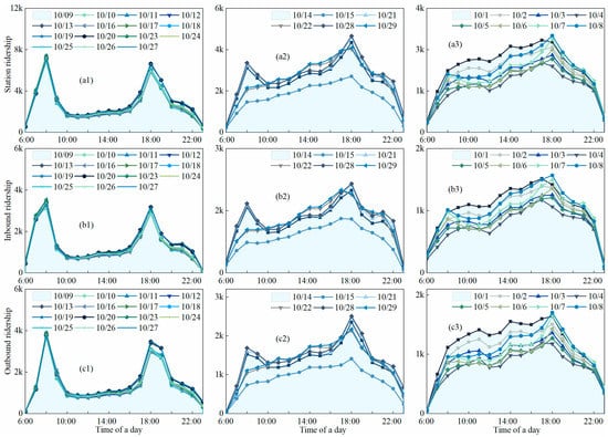 Figure 6a1–c1 show that there is a strong consistency in the distribution of metro ridership, inbound ridership, and outbound ridership from 6:00 to 22:59 on weekdays. Moreover, the distribution of metro ridership, inbound ridership, and outbound ridership shows the same significant morning peak and evening peak. The morning peak hours are from 7:00–9:00, and the evening peak hours are from 17:00–20:00. These findings are consistent with that of the related research [56]. Comparing Figure 6a2–c2, it can be found that the distribution of metro ridership, inbound ridership, and outbound ridership is significantly different between Saturday and Sunday. The distribution of metro ridership, inbound ridership, and outbound ridership has a strong consistency on Saturday, with significant morning and evening peak hours. Peak hours on Saturdays are similar to that on weekdays. In contrast, the distribution of metro ridership, inbound ridership, and outbound ridership on Sundays greatly varies without significant peak hours. The distribution trends of metro ridership, inbound ridership, and outbound ridership on holidays in Figure 6a3–c3 are a large variability across days. This is similar to the distribution of metro ridership, inbound ridership, and outbound ridership on Sundays, both without significant peak hours.