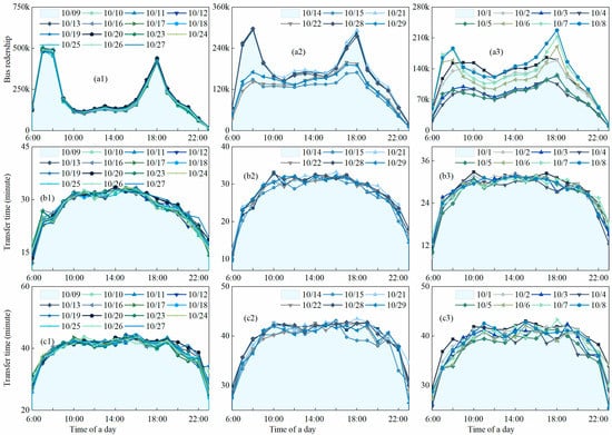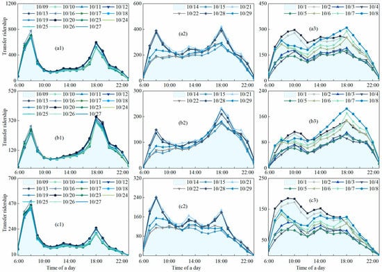The distribution characteristics of the transfer ridership: (a1–a3) denote transfer ridership of metro stations on weekdays, weekends, and holidays, respectively; (b1–b3) denote transfer ridership of the metro-to-bus mode on weekdays, weekends, and holidays, respectively; (c1–c3) denote transfer ridership of the bus-to-metro mode on weekdays, weekends, and holidays, respectively.