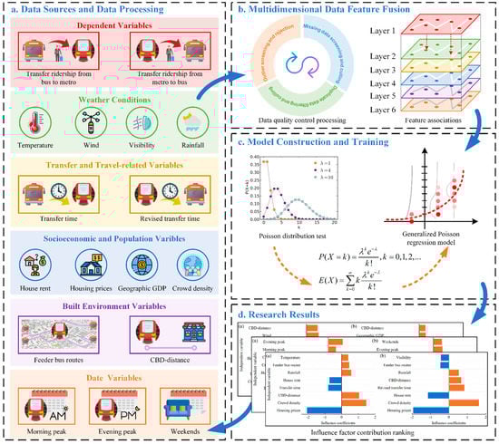 With the rapid development of urbanization and continuous growth in the population, the demand for public transportation is also gradually increasing [1]. Passengers usually cannot reach their destinations directly by a single transport mode, and transfers are often essential, especially for those traveling medium–long distances, who must often make one or more transfers [2,3]. Therefore, the transfer between different transport modes has become an integral part of public transport systems [4]. Although there are many feeder modes connected to metro networks, such as walking, bicycling, and sharing electric bikes, buses are still the main feeder mode for passengers traveling to and from metros [5,6,7,8]. Accordingly, this study focuses on the transfer between metro and bus systems. The definitions of the two transfer modes—namely, metro-to-bus and bus-to-metro—can be found in [9]. In this paper, the transfer ridership of the metro-to-bus mode is measured in terms of the number of transfer passengers from metro to bus per hour, and the transfer ridership of the bus-to-metro mode is measured in terms of the number of transfer passengers from bus to metro per hour. A complicated transfer system usually connects a metro network with a feeder bus network and can facilitate travelers, increase the accessibility of metros, and reduce congestion and environmental pollution [10,11]. However, the transfer is unpopular among passengers because it increases travel time and reduces travel efficiency [12,13]. Therefore, it is critical to identify the determinants of transfer ridership to further propose targeted improvement measures to cope with the adverse impacts of various factors on transfer ridership [14]. This can help us better understand the transfer ridership, improve the transfer experience of passengers, and ultimately increase the attractiveness of public transportation [15].