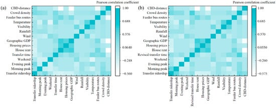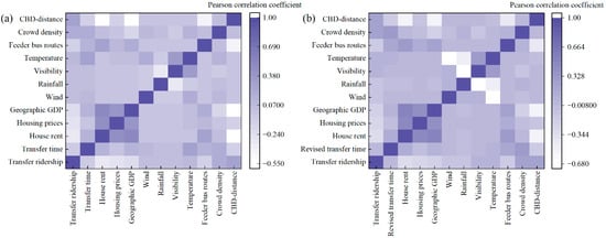 The Pearson correlation coefficient of various variables on holidays: (a) the metro-to-bus mode and (b) the bus-to-metro mode.
