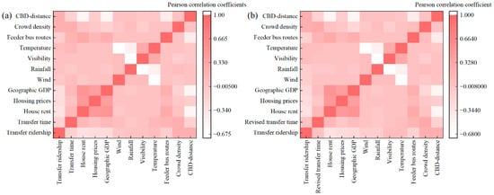 The Pearson correlation coefficient of various variables during typhoon weather: (a) the metro-to-bus mode and (b) the bus-to-metro mode.