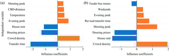 Figure 13 shows that among the influencing factors, transfer time, socioeconomics, and population have a significant impact on transfer ridership on weekdays and weekends. Peak hours positively influence the transfer ridership. Morning peak, evening peak, low housing prices, low rent, and high crowd density can attract more transfer ridership at metro stations, while the opposite can attract less transfer ridership at metro stations. This may be explained by the large number of commuters gathering during peak hours. The majority of commuters require transfers to reach their destination. Rent and housing prices are negatively associated with the transfer ridership. This may be because people in stations with higher rent and housing prices usually have higher incomes and travel mostly by taxi or private car, rarely relying on public transportation. Crowd density is positively associated with transfer ridership because metro stations with high pedestrian density usually have more transfer passengers.