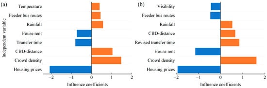 Influence coefficients are associated with the transfer ridership on holidays: (a) the metro-to-bus mode and (b) the bus-to-metro mode.