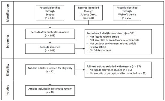 The search in three databases returned 833 results, from which 225 records were duplicates, and therefore removed. The remaining 608 abstracts were screened and 531 records were excluded for not relating to façades or acoustics, and/or for not taking place outdoors. The full text of the remaining 77 papers was assessed and 37 records were excluded due to the eligibility criteria. The final number of papers included in this review is 40 (forty) as shown in Figure 1.