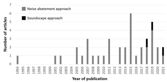 Figure 2 presents the number of publications published per year from 1994 to 2021 (n = 40) differentiating between studies that focus on noise abatement in which the decibel level is the main descriptor (n = 37) and studies that focus on the soundscape in which people’s reported perception of the acoustic environment is the main descriptor (n = 3).