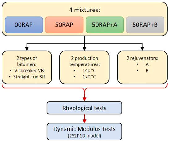 Considering the lack of papers concerning these aspects in the literature, and in order to provide a deeper comprehension of the influence of the variables highlighted before, this paper focused on the effects determined by the virgin bitumen distillation process and by the temperature during HRMA mixing on the material performance. In particular, the study evaluated the rheological properties of mixtures produced using a high amount of RAP (50%), two alternative kinds of rejuvenator (coded with the letters A and B), two mixing temperatures (140 °C and 170 °C), and two different neat bitumen types derived from visbreaking or straight-run distillation processes. Table 1 summarizes the mixtures tested, while Figure 1 shows the experimental program in a flowchart.
