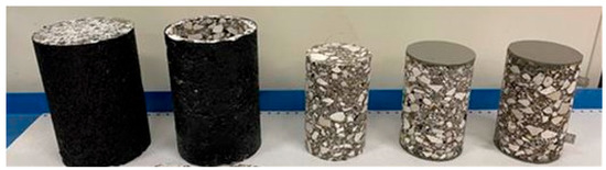 The following laboratory mixing procedure was followed: the aggregates and the RAP were heated in the oven, according to EN 12697-35, either at 140 °C or 170 °C for 3 h while the virgin binder was heated for 90 min. The materials were mixed by means of a mechanical mixer, initially placing only the coarse aggregates and the RAP, then adding the bitumen, and finally the filler. Then, the loose bituminous mixtures were kept in the oven for 30 min to reproduce the hauling time and equalize temperature within the mix. In the 30 min conditioning in the oven and the following compaction procedure, the mix temperature was again 140 °C or 170 °C. In the end, two cylindrical specimens for each mixture with 150 mm diameter were made using a Superpave gyratory compactor (EN 12697-31), fixing the final height of the specimens to 150 mm. The mass of the loose mix of each specimen (6250 g) was determined in order to obtain a final value of 4% for the air void content of the cored samples.