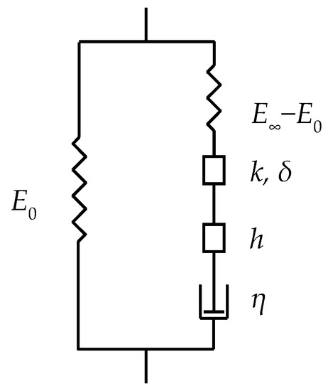 The 2S2P1D rheological model (see Figure 6) was used to fit the experimental data [47]. The model consists of a series of a linear dashpot, two parabolic elements and a spring of stiffness E∞ − E0, assembled in parallel with a second spring (E0) (Figure 5). The mathematical representation of the model can be described through the following expression: