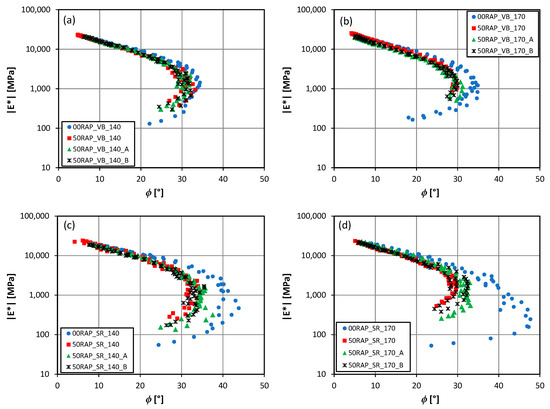 For a clearer comprehension of the influence of the bitumen production process and the mixing temperature on the |E*| and ϕ master curves, these factors are represented by plotting the same mixtures (00RAP, 50RAP, 50RAP + A and 50RAP + B) in separated graphs (Figure 12 and Figure 13). In this way, with the equivalent mix composition, the differences in the complex modulus can be directly related to the mixing temperature and to the type of virgin bitumen used. In Figure 12a and Figure 13a, it can be noted that the mixtures with visbreaker bitumen had almost identical master curves of |E*| and ϕ for both 140 °C and 170 °C mixing temperatures. The master curves of the HMA with straight-run bitumen showed noticeably lower stiffness and higher phase angle in comparison with the HMA with VB, especially at low frequencies/high temperatures. Moreover, for the SR bitumen, a slight increase in |E*| and a decrease in ϕ were observed when increasing the mixing temperature from 140 °C to 170 °C (even if for one of the 00RAP_SR_170 specimens the peak of the phase angle was higher). In the result interpretation, it is important to consider that the rheological behavior of the unaged VB and SR bitumens, tested with the dynamic shear rheometer in a previous research [45], was almost identical. Therefore, it can be deduced that the VB bitumen had already suffered severe short-term aging at the mixing temperature of 140 °C and a temperature increase did not determine a further worsening of the performance. On the other hand, the SR bitumen showed a significantly lower aging sensitivity in the short term, but the increase in mixing temperature to 170 °C was slightly more detrimental.