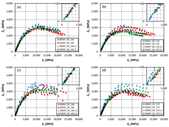 The Black and Cole–Cole diagrams were also used for the first estimation of glassy and static asymptotes to be fit into the 2S2P1D model before the error minimization (Equation (4). In particular, the Black diagram allowed estimating the glassy modulus (E∞) as the intersection of the prolongation of the top data with the y-axis. For all the tested samples, the glassy modulus ranged between 42 and 48 GPa. Using the Cole–Cole diagram, the static modulus (E0) can be obtained as the intersection of the data with the x-axis (enlarged plots on the upper right side of the graphs in Figure 9). The estimation of E0 changed a lot depending on the RAP content, the rejuvenator A or B, the type of virgin bitumen, and the mixing temperature. In particular, E0 ranged between 35 MPa and 195 MPa, respectively, obtained for a specimen of the mix 00RAP_SR_140 and a specimen on the mix 50RAP_VB_170.