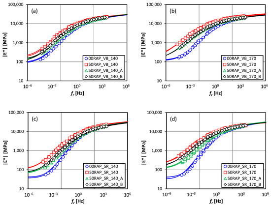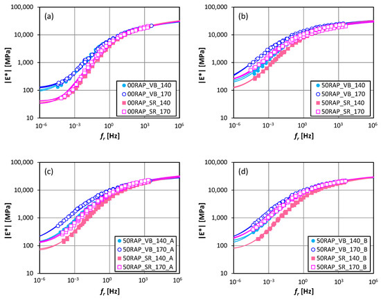 Master curves of |E*|: (a) visbreaker bitumen, 140 °C; (b) visbreaker bitumen, 170 °C; (c) straight-run bitumen, 140 °C; (d) straight-run bitumen, 170 °C.
