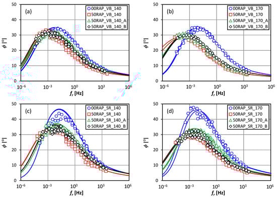 Master curves of ϕ: (a) 00RAP; (b) 50RAP; (c) 50RAP + A; (d) 50RAP + B.