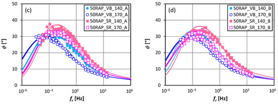 Master curves of ϕ: (a) visbreaker bitumen, 140 °C; (b) visbreaker bitumen, 170 °C; (c) straight-run bitumen, 140 °C; (d) straight-run bitumen, 170 °C.
