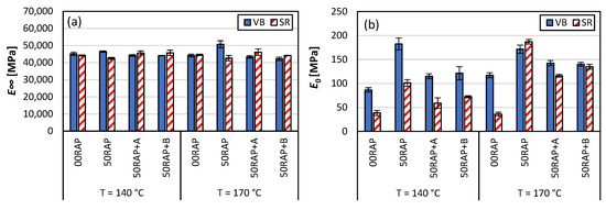 Figure 14a,b respectively report the values of the glassy and viscous asymptotes of the E* master curves using the 2S2P1D model. From the graphs, it can be noted that comparable values of E∞ were obtained for the different mixtures (approximately around 45 GPa) except for the mix 50RAP_VB_170 which provided an E∞ value of about 50 GPa. Differently, E0 was sensitive to the presence of RAP/rejuvenator, the virgin bitumen type and the production temperature. In particular, E0 values were higher in the case of higher mixing temperature, presence of 50% RAP in the mix and use of visbreaker bitumen. The presence of the rejuvenator contributed to the decrease of the viscous asymptote value but did not reach the performance of the mixes without RAP. It must be highlighted that the experimental data did not allow reaching the asymptotic trend of the model at low reduced frequencies, as the “softer” mix condition investigated was T = 50 °C, f = 0.1 Hz, so the values of E0 represent a mere estimation. However, a significant result and a good correlation with the physical behavior of the different materials were obtained. In addition, specimen-to-specimen variability was very low in the case of both E∞ and E0 approximation.