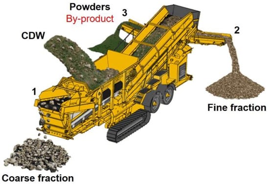 Construction and demolition waste (CDW) transformation and grinding process: coarse 1, fine 2 and powder 3 fractions.