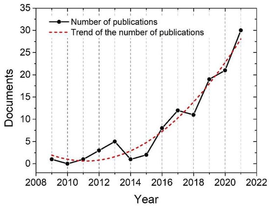 Evolution of the number of publications related to the alkaline activation or geopolymerization of CDW. Source: Scopus Elsevier database. Search: TITLE-ABS-KEY (construction AND demolition AND wastes) AND TITLE-ABS-KEY (alkali-activated AND material) OR TITLE-ABS-KEY (geopolymer). Total publications (between 2009 and 2022): 133 documents.