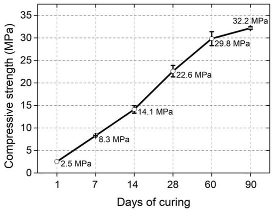 The hybrid cement was obtained from the alkaline activation of a precursor composed of CDW-Mixed with the addition of 10% UG-type OPC (% by weight). Ninety percent of the hybrid cement corresponding to the geopolymer precursor (CDW-Mixed) was composed of 30% Co powder + 30% Ce powder + 30% M powder (90% total). As shown in Figure 3, these powders were by-products collected from the crushing process of Co, Ce and M. The CDW powders have a fine size that did not allow them to be reused as aggregates in mortar and concrete mixtures according to the specifications of the ASTM C33 standard [9]. The average particle size of CDW-Mixed was 57.6 µm. The value reported for the OPC used as an addition (10%) was 21.3 µm. The chemical composition (X-ray fluorescence (XRF)) of CDW-Mixed consisted mainly of SiO2 (51.5%), CaO (14.6%), Al2O3 (14.3%), Fe2O3 (6.7%) and other materials (5.3%), with a loss on ignition (LOI) of 7.6%. As an alkaline activator (AA), a mixture of sodium hydroxide (NaOH) (industrial grade) and sodium silicate (waterglass) (Na2SiO3) (SiO2 = 32.1%, Na2O = 11.9%, H 2 O = 56.0%) (industrial grade) was used. For the preparation of the AA, a ratio (by weight) of NaOH/Na2SiO3 of 0.25 was set, equivalent to a modulus of SiO2/Na2O solution (molar) of 1. The content of AA used in mixtures varied by 0.2, 0.3 and 0.4, where these values are equivalent to the ratio (by weight) AA/(precursor + OPC). The compressive strength of the alkali-activated hybrid cement can be observed in Figure 4. The cement reached strengths of 22.6 MPa at 28 days of curing at room temperature (≈25 °C) and 32.2 MPa at 90 days. A detailed description of the synthesis and characterization of the hybrid cement used can be found in a previous study [10].