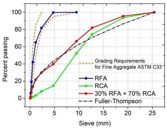 The recycled fine aggregate (RFA) was obtained from the combination of RFA—Ce (No. 4), RFA—Co (No. 4), RFA—Ce (No. 16) and RFA—Co (No. 16) (Figure 3) in proportions of 20, 20, 30 and 30% (by weight), respectively. From this combination, compliance with the gradation limits established by the ASTM C33 standard was achieved [9] for fine aggregates (sands) (Figure 5). The recycled coarse aggregate (RCA) was obtained from the combination of RCA—Co (1 in.) and RCA—Co (3/4 in.) at 85 and 15% (by weight), respectively. The ideal gradation of the recycled aggregates (RFA and RCA) for the concrete mixtures was obtained from the Fuller–Thompson theory [37] and corresponded to a combination of RFA and RCA of 30 and 70% (by weight), respectively (Figure 5).