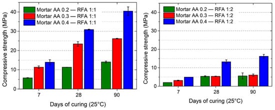 The effect of the contents of AA (0.2–0.4) and RFA (cement:aggregate ratio of 1:1 and 1:2) on the compressive strength of alkali-activated mortars can be observed in Figure 6. In general, the content of AA (NaOH + Na2SiO3) favors the development of the mechanical strength of the mortars. At 28 days of curing (25 °C), the compressive strengths of the AA 0.2, AA 0.3 and AA 0.4 mortars with RFA contents of 1:1 were 11.3 MPa, 23.4 MPa and 30.9 MPa, respectively. On the other hand, in the case of RFA contents of 1:2, the strengths were 5.4 MPa, 5.5 MPa and 13.2 MPa, respectively. In reference to the above, a higher content of AA (NaOH + Na2SiO3) increases soluble silica species (–Si–O–) and provides the necessary conditions for geopolymerization reactions (alkaline activation) [14]. Similarly, sodium silicate (Na2SiO3) favors the union (adherence) of the precursor particles that do not react (anhydrous), thus increasing the resistance of alkali-activated materials based on low reactivity aluminosilicates, such as CDW powders (concrete, ceramic and masonry waste) [10].