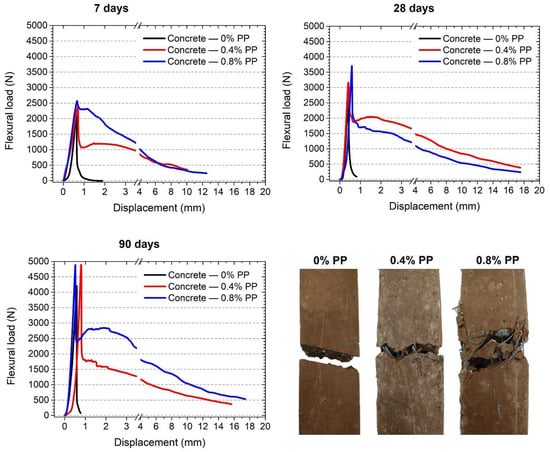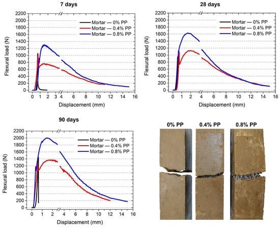 In general, the load vs. displacement shows an increase in the maximum breaking load proportional to the fiber content in the mixture (0.8% PP > 0.4% PP > 0% PP) and the curing age (90 days > 28 days > 7 days). Similarly, the post-fracture benefit of the fibers in relation to flexural–tensile stresses increases; that is, increases in the post-cracking toughness and ductility of the mortars are promoted by a type of gradual failure governed by pull-out (progressive pull-out) of the fibers [50]. This phenomenon can be corroborated by the photographs of the failure modes recorded in Figure 7, where the “bridging” of the cracks by the fibers is evident, which is greater with increasing fiber content. As observed in the graphs, a fiber content of 0.8% in the fiber-reinforced mortars caused the phenomenon of deformation hardening; that is, it increased the capacity to support loads even when the matrix exceeded the resistance to the first crack.