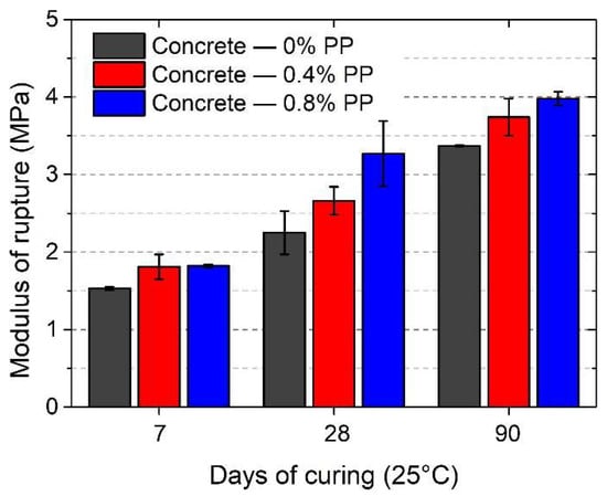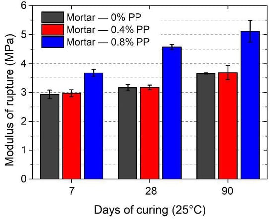 Flexural modulus of rupture of fiber-reinforced mortars produced from AA0.4—RFA1:1 mortar (cured at 25 °C): effect of polypropylene (PP) fiber.