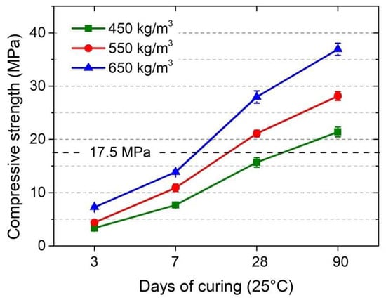 Figure 9 presents the compressive strength results obtained at the concrete level, highlighting the effect of the hybrid cement contents of 450 kg/m3, 550 kg/m3 and 650 kg/m3. In general, the results obtained show that a higher content of hybrid cement increases the compressive strength of alkali-activated concretes. In fact, the maximum mechanical strengths were obtained for the 650 kg/m3 mixture, with values of 7.3 MPa, 13.9 MPa, 28.0 MPa and 36.9 MPa reached at 3, 7, 28 and 90 days of curing, respectively. According to the Colombian Earthquake Resistant Standard (NSR-10) [51], equivalent to ACI Regulation 318 [52], the minimum compressive strength to classify a concrete as structural is 17.5 MPa. In this sense, the 550 kg/m3 (21.1 MPa) and 650 kg/m3 (28.0 MPa) concretes meet the minimum strength necessary to be classified as structural at 28 days of curing. It should be noted that if a longer curing age is taken into account (90 days), all the mixtures, including the 450 kg/m3 concrete, exceed the limit established by the NSR-10. The strength values at 90 days of curing of the 450 kg/m3, 550 kg/m3 and 650 kg/m3 concretes were 21.4 MPa, 28.1 MPa and 36.9 MPa, respectively. On the other hand, it should be noted that the increase in compressive strength between 3 and 90 days of curing for these mixtures was between 408% and 544%, which demonstrates the importance of guaranteeing an adequate curing process. In this regard, as mentioned in the methodology (Section 2.3), the curing of the concrete mixtures was performed at room temperature (25 °C) and at a relative humidity greater than 80%. The graphs of the evolution of strength show a marked tendency for increased mechanical performance at greater ages (i.e., greater than 90 days).
