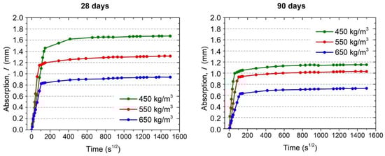 In addition to the mechanical characterization, the physical properties of the alkali-activated concretes were determined, such as density, absorption and porosity. Similarly, the capillary water absorption rate (sorptivity) was studied at 28 and 90 days of curing. In Table 7, the density, absorption and porosity results are presented. In agreement with the results for compressive strength (Figure 9), it can be observed that a higher content of hybrid cement promotes a slight densification of the concretes and at the same time a decrease in the absorption and porosity of the mixtures. With reference to the above, 650 kg/m3 concrete was 4.1% denser at 28 days than concrete with a lower cement content (450 kg/m3). Similarly, decreases in absorption of −17.2% and porosity of −10.5% can be observed when comparing the 650 kg/m3 and 450 kg/m3 concretes. This behavior could be related to the fact that a higher cement content decreases the volume of aggregates present in the mixture (Table 5). As presented in Table 2, the RFA and RCA have absorption capacities of 8.96% and 5.82%, respectively. In effect, a lower content of recycled aggregates (RFA and RCA) in turn decreases the porosity and absorption of the mixtures.
