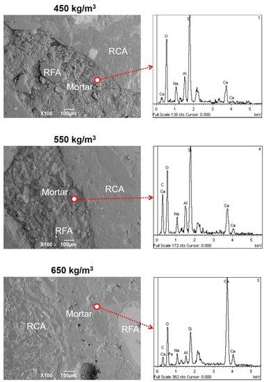 In Figure 13, scanning electron microscopy (SEM) images (×100) obtained for the alkali-activated hybrid concretes (450 kg/m3, 550 kg/m3 and 650 kg/m3) can be observed.