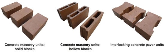 To validate the application potential of alkali-activated materials based on CDW in the construction sector, prefabricated elements, such as solid blocks, perforated (hollow) blocks and pavers, were produced from the 550 kg/m3 concrete mixture (Table 5). The prefabricated elements were produced by casting the concrete mixture. The two types of concrete blocks produced according to the NTC 4026 standard [41] corresponded to (1) solid load-bearing units 200 mm long × 100 mm wide × 80 mm high and (2) vertically perforated (hollow) units 400 mm long × 120 mm wide (wall thickness of 25 mm) × 200 mm in height. The concrete paver produced was “type 2 with I-shape”, according to the classification established by the NTC 2017 standard [42]. The paver was an inscribed rectangle 200 mm in length and 90 mm in width, with a height of 100 mm.