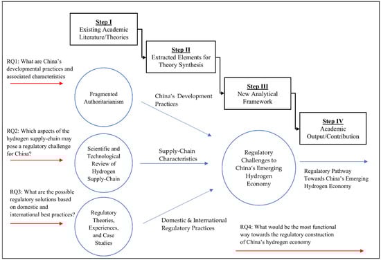 As such, the aim of this paper is to offer a new integrative view of the potential regulatory challenges to China’s emerging hydrogen economy, by using the conceptual article model, and, more specifically, theory synthesis [20]. Under this format, this paper aims to answer each of the four specific academic questions presented above by, first, identifying the specific and relevant subject-area theories and, second, presenting or applying them in a manner specifically focused to the core academic question of this paper, i.e., the regulatory construction of China’s emerging hydrogen economy. For example, in relation to questions of China’s current and standardized industrial development model, the Fragmented Authoritarianism model, an important and widely accepted theory within Contemporary China Studies, is used below. However, rather than providing a limited literature review of the subject matter, elements directly applicable to the development of China’s prospective hydrogen economy, such as its encouragement towards forming industrial interest groups, is presented. An illustration of this research design is provided in Figure 1 below.