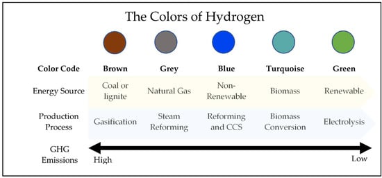 Not all hydrogen is created equal, but once produced and mixed into circulation, it becomes impossible to differentiate. The characteristics of hydrogen as a commodity, i.e., being interchangeable and homogeneous, raise important regulatory questions regarding the environmental sustainability of hydrogen based on its industrial origins. At one end of the spectrum, the majority of hydrogen produced today is via conventional fossil fuel resources such as the steam reforming process, and as such, produce significant CO2 emissions [35,36]. Alternatively, at the other end of the spectrum, producing hydrogen using renewable energy would produce negligible emissions [37]. In addition, hydrogen production is also associated with various other life-cycle emissions [38]. For example, the emissions derived from the production of hydrogen from non-renewable feedstocks such as coal and natural gas can be reduced by 85% with carbon capture and storage (CCS) technologies [16]. Altogether, a number of factors contribute to the overall environmental desirability of the different types of hydrogen (Figure 2) and will require specific regulatory intervention to enable markets to differentiate between their origins of production.