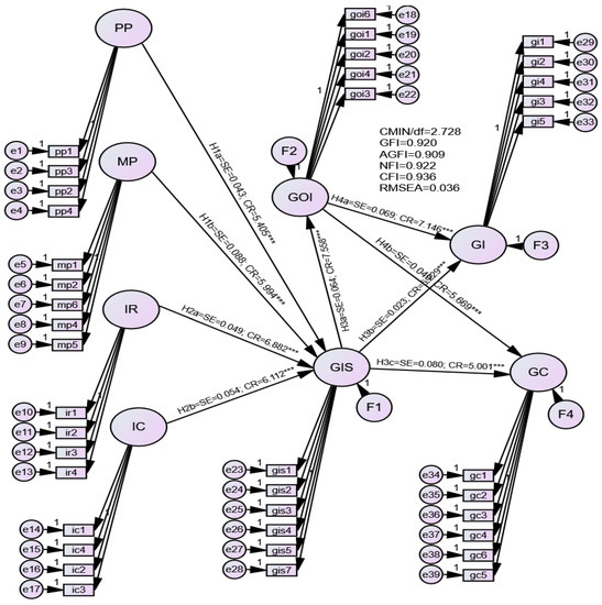 Moreover, to check the suggested effects, we observed that PP and MP had a positive and significant effect on GIS (H1a = SE = 0.043; CR = 5.405 ***; H1b = SE = 0.088; CR = 4.994 ***; p ≤ 0.01). The results mean that hypotheses H1a and H1b are accepted (see Table 4 and Figure 2). In a similar way, we confirmed that IR and IC had a positive and significant effect of on GIS (H2a = SE = 0.049; CR = 6.882 ***; H2b = SE = 0.054; CR = 6.112 ***; p ≤ 0.01). Therefore, hypotheses H2a and H2b are accepted. Moreover, we noted that GIS had a positive and significant effect on GOI, GI and GC (H3a = SE = 0.064; CR = 7.558 ***; H3b = SE = 0.023; CR = 5.229 ***; H3c = SE = 0.080; CR = 5.001 ***; p ≤ 0.01). Therefore, hypotheses H3a, H3b and H3c are accepted. Finally, we noted that GOI was a positive and significant predictor of GI and GC (H4a = SE = 0.069; CR = 7.146 ***; H4b = SE = 0.049; CR = 5.669 ***; p ≤ 0.01) (see Figure 2 and Table 4). Consequently, H4a and H4b are both accepted.