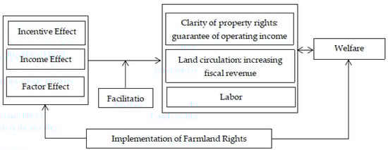 The existing literature on the impact of implementing the confirmation of farmland rights were based on two points [,]: the confirmation of farmland rights and farmland circulation, and the confirmation of farmland rights and changes in farmers’ income, or the impact of the confirmation of farmland rights on farmers’ welfare. There were three viewpoints. Some researchers believed that the confirmation and registration of farmland rights would clarify the relationship of land property rights, increase the stability of property rights and reduce the costs of transactions [,,]. It could significantly increase farmers’ willingness to circulate farmland, improve village infrastructure conditions, and promote the non-agricultural employment of rural labor [,,,], as the farmland circulation is greatly affected by non-agricultural employment []; of course, it was thought that improved transportation infrastructure could create economic vitality in villages [], provide jobs and increase farmers’ income []. Taking Cambodia, Vietnam, China, Rwanda and other developing countries as examples, it was believed that stability of farmland rights would help farmers invest in land, increase farmland productivity and leases, and, finally, increase farmers’ income [,,]. Other researchers believed that the confirmation of farmland rights would strengthen the subjectivity of property rights and enhance the “endowment effect” of farmers, which would increase the expected benefits of farmers, and increase costs of circulation; therefore, it would hinder land circulation [,,,]. There were also a few researchers who believed that the impact of the confirmation of farmland rights on land circulation was not obvious [,,,]. Regarding the relationship between land circulation and farmers’ income, some researchers believed the confirmation of farmland rights could strengthen the protection of farmers’ property rights, was conducive to the objectivity and fairness of land value and compensation, increase the rents of land circulation, reduce the opportunity cost of labor migration, and increase employment opportunities [,]. Regarding the impact of the confirmation of farmland rights on farmers’ welfare, some researchers believed that the confirmation of farmland rights would increase the property income of farmers, improve social welfare and realize the sustainable development of farmers [,]. However, some researchers used Sen’s welfare theory to study the welfare of farmers before and after the confirmation of farmland rights, and it was concluded that the confirmation of farmland rights would reduce the individual welfare level of farmers, although it would lessen the gap between welfare levels among farmers [].