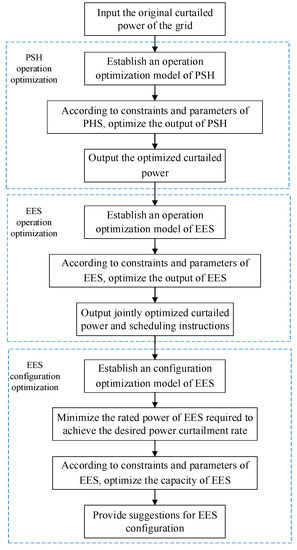 In this paper, the proposed combined operation model of PSH and EES is used to reasonably arrange the operation of PSH and EES, so that the two cooperate to reduce the amount of curtailed power in the power grid and improve the accommodation of renewable energy. On this basis, using the proposed EES configuration optimization model, combined with the expected power curtailment rate, the corresponding EES configuration is solved, and the investment cost is calculated, which satisfies the actual situation for different needs for power curtailment rates. The rationality and effectiveness of the proposed optimization method and optimization model are verified by actual cases.