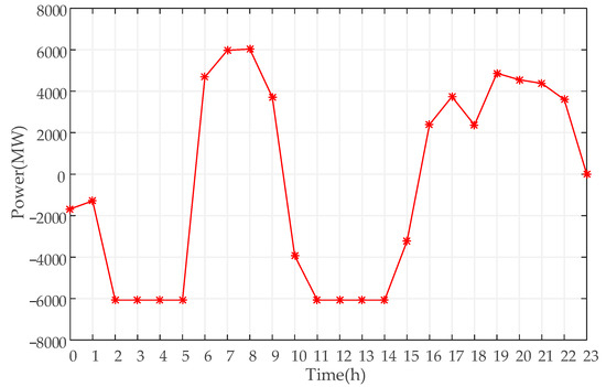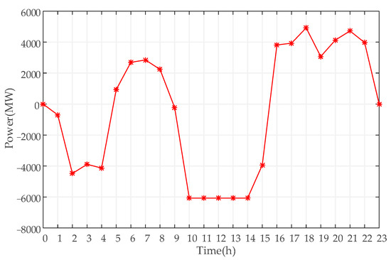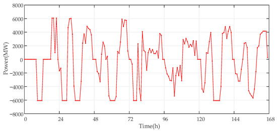 For the operation optimization of the PSH power station, according to the objective function of PSH operation optimization and various constraints, the hourly output of PSH in a typical week is calculated, and the operation curve of a typical week is drawn, as shown in Figure 3.