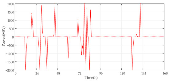 For the operation optimization of EES, according to the objective function of operation optimization and various constraints, the output of EES in a typical week is calculated. Since the configuration optimization of EES has not yet been carried out, the rated power of 2000 MW is directly selected as the assumption for the study of operation optimization. The operation curve of EES in a typical week is shown in Figure 4.
