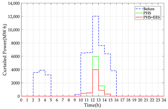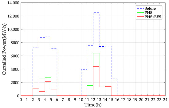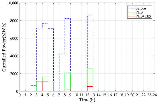 It can be seen from Figure 16 that from 2:00 to 5:00 on this typical day, since the curtailed power after the PSH operation has been completely accommodated, the EES only needs to be charged once and discharged once. The curtailed power reached the maximum value of 12,031.05 MW·h from 12:00 to 13:00. Due to the pumping of the PSH unit, the curtailed power dropped to 5961.05 MW·h. On this basis, the EES was charged for accommodation, and the curtailed power further decreased to 3961.05 MW·h.